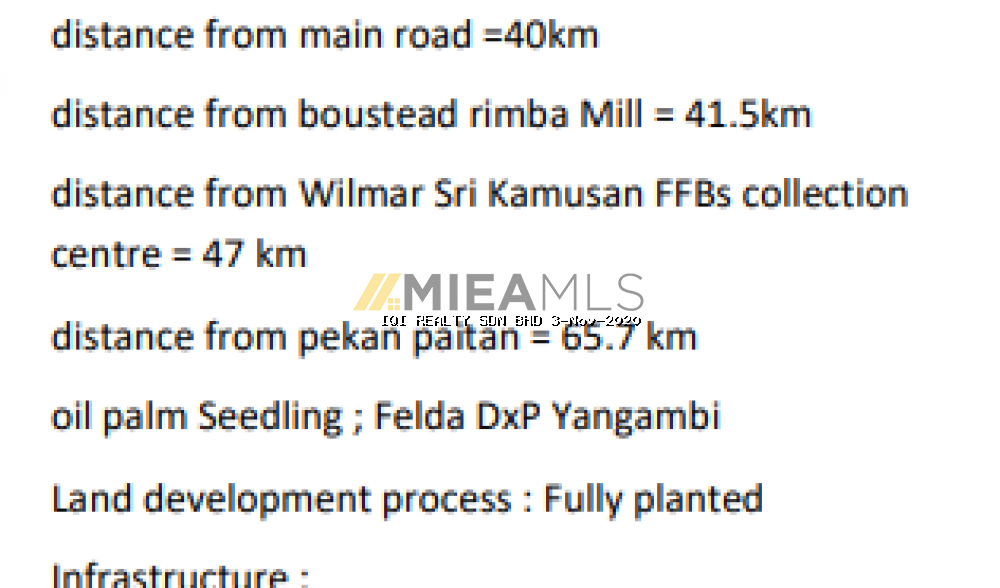 undulating to hilly terrain distance from main road =40km distance from boustead rimba Mill = 41.5km distance from Wilmar Sri Kamusan FFBs collection centre = 47 km distance from pekan paitan = 65.7 km oil palm Seedling ; Felda DxP Yangambi Land development process : Fully planted Infrastructure : a)1 unit office b)Rumah batu 6 unit = 7 block (in progress - 3 unit) c)Rumah Semi-d (2 Unit) - 1 block d) Temporary quarter - 2 block e) 1 workshop e) 1 fertilizer store f) 1 steel Ramp g) 1 wooden ramp h) 1 weighbridge price = RM 28,000.00/acre