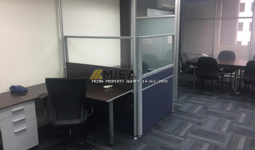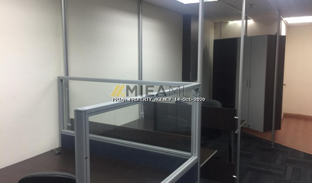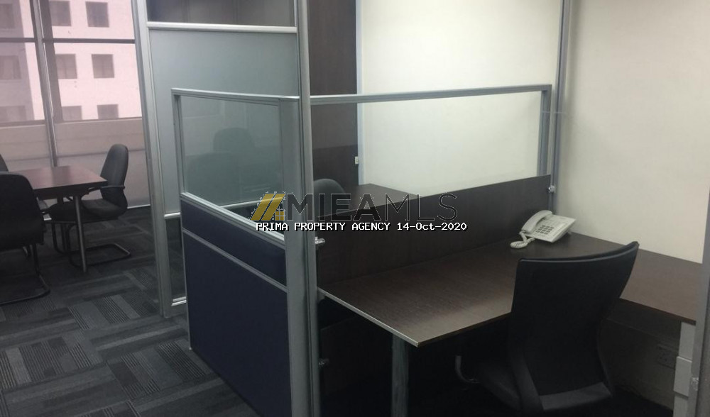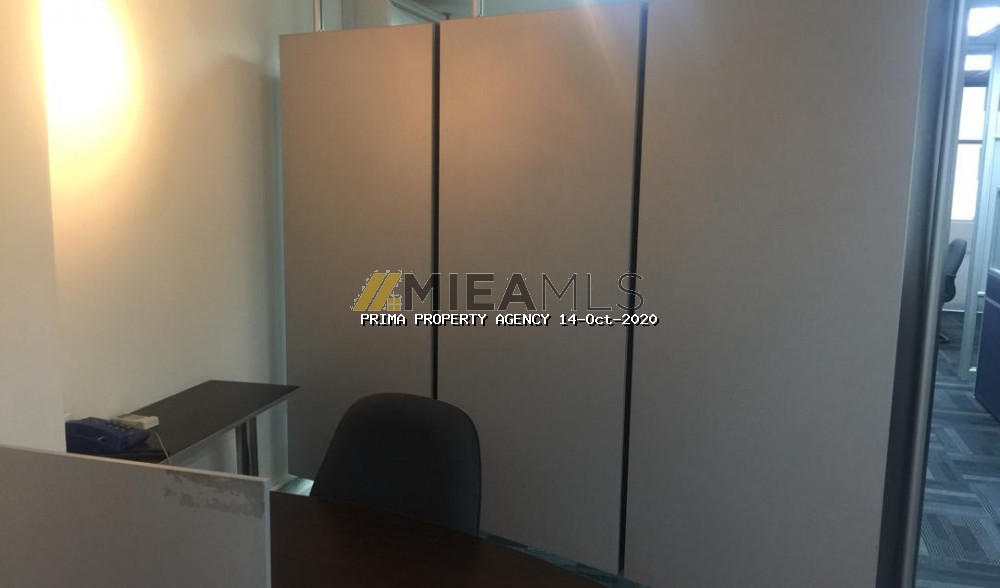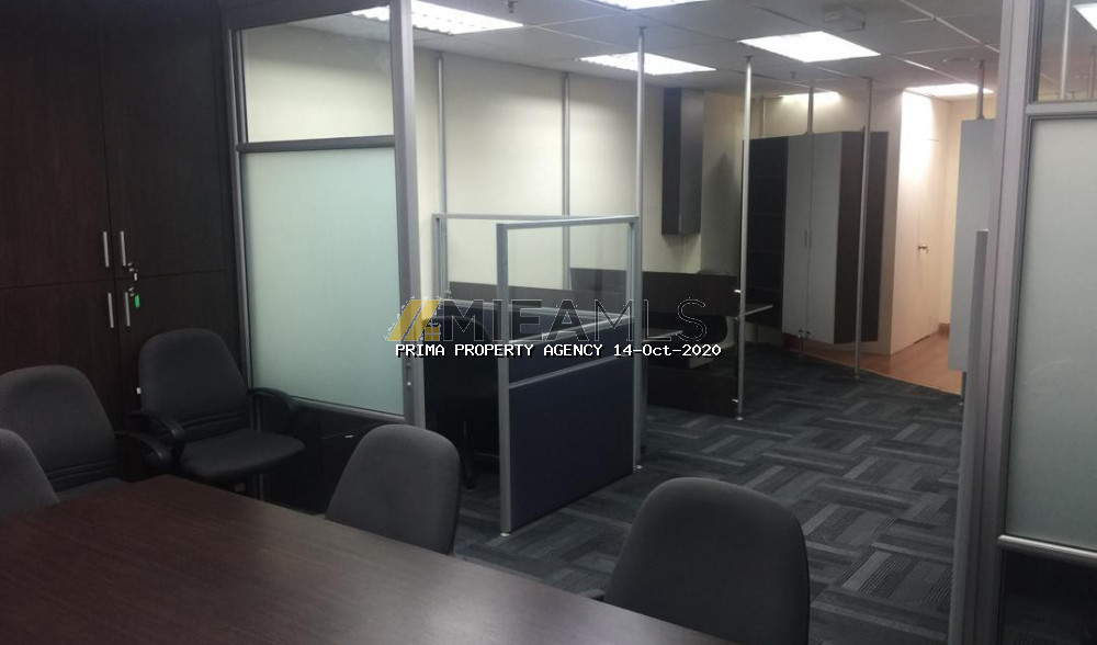 This unit is a modern office fitted with a big glass partitioned meeting room and an Open office concept area with workstations. Its furnished with air cond units, lights, meeting table, workstations & chairs. Lots of storage space with built-ins cabinets lining the 2 walls. Move in condition.