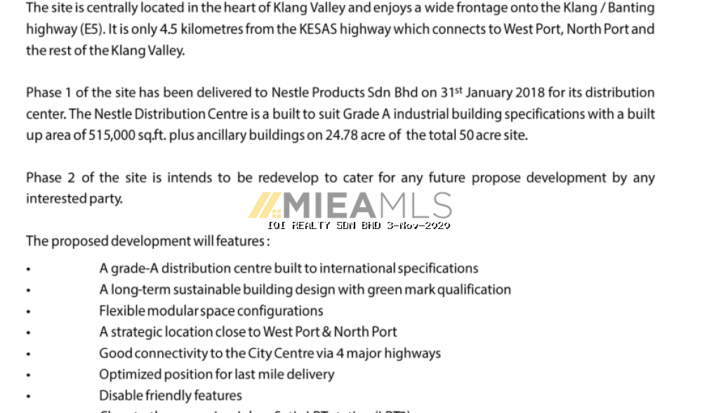 The Axis Industrial Facility @ Klang/Banting comprises of two (2) single-storey factory buildings with a 3 and 4-storey office annex respectively as well as other ancillary buildings. It is located at Sijangkang Klang which is approximately 19 km from the North South Expressway (Kesas) Interchange, 4 minutes driving distance to Johan Setia Station (LRT) (via google map) and 13Km to Klang Town Centre. Phase 2 of the site is intends to be redevelop to cater for any future propose development. Approximate built up is 485,312 sq.ft